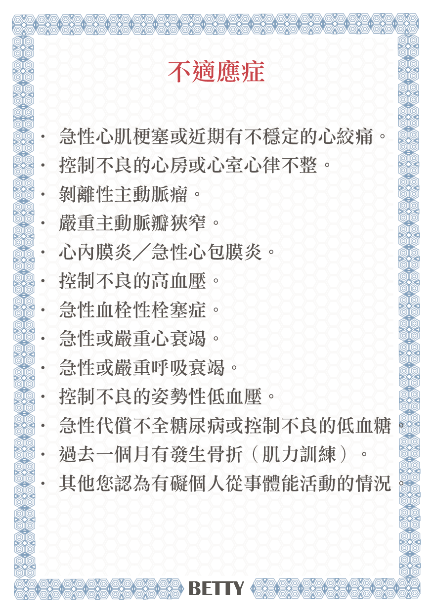 什麼是體適能檢測 09/11/2024 / 什麼是體適能檢測?誰需要檢測?如何檢測? ViviFrail 體適能檢測 – 操作步驟 ViviFrail 體適能檢測 – 不適應症 進行 ViviFrail 體適能檢測時,應該要特別注意受測者,尤其是高齡長輩或明顯衰弱者有如下列的不適應症狀,提供後續體適能訓練時處方籤的設計與評量。